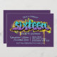 Une invitation de graffiti désordonnée pour un enfant de 16 ans. Violet, bleu et orange.
