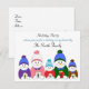 Une invitation fantaisiste de fête de vacances avec une famille de bonhomme de neige avec des chandails colorés, des casquettes et une tasse de chocolat chaud. Customisez avec toutes les informations de votre parti selon vos besoins.