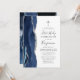 Le bord gauche de cette élégante invitation à la première communion moderne comporte une bordure en aquarelle bleu marine ornée d'une parties scintillant en faux argent. Une fausse croix de feuille argent apparaît au-dessus du texte personnalisable, qui combine écriture manuscrite, cuivre et polices italiques en gris charbon sur un arrière - plan blanc. L'envers est assorti d'un design d'agate bleu marine et argent.