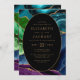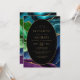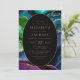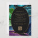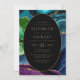 Un cadre d'agate d'aquarelle en gras, dans les tons bleu turquoise, vert, bleu marine et violet bordé de parties scintillant en faux or, sert de décor au texte de couleur or sur un arrière - plan ovale noir. L'envers offre de l'espace pour les détails du mariage, ainsi qu'un code QR que les clients peuvent scanner pour visiter votre site Web et RSVP, ce qui permet d'économiser le coût d'impression et d'envoi de cartes RSVP séparées.