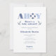 A simple and uncluttered navy blue and white nautical theme baby shower invitation design to welcome a little boy. The anchor and life ring are from my original watercolor artwork.