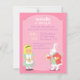 Invitation vos invités de fête à une fête de thé d'anniversaire à Wonderland avec cette invitation à la fête à thème Alice in Wonderland! Alice dans un groupe de cheveux, robe bleue et blanc pinaavant qui se tient sur une bouteille avec un étiquette "Buvez-moi". le lapin blanc dans une chemise bleue et une veste rouge, un parapluie sous son bras et en regardant l'heure de la montre de poche. Arrière - plan rose avec des points disposés en carrés diagonaux. Coloré et adorable, cet invitation est parfait pour les filles d'anniversaire qui aiment l'histoire Alice au pays des merveilles!
