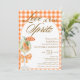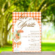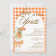 Rustic Elegant Chic Love At First Spritz Bridal Shower Invitation - Doté d'une aquarelle Aperol spritz avec une garniture en tranche orange, ornée d'un arc orange coquette. L'invitation a un arrière - plan orange rustique, en vichy plaid et un cadre en arc. Les mots "Love at first Spritz" sont écrits dans un mélange de calligraphie de script raffiné et d'élégant texte brun bloc. Modifiez ce modèle d'invitation de douche nuptiale avec vos propres détails d'événement. Également disponible en téléchargement numérique instantané, facilement envoyer par texte, email ou médias sociaux.