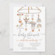 Cartes d'invitation Baby Shower Cirque modernes et mignonnes. Belle ambiance scandinave avec un éléphant, un homme fort, un maître de piste, un cheval, un phoque, un arc-en-ciel, des nuages et des étoiles suspendus à un mobile. Palette de couleurs neutres pour un bébé garçon ou fille. Terre cuite, gris bleu poussiéreux et blanc.
