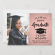 Annoncez un baccalauréat ou une collégiale diplôme et la famille et les amis invitations à célébrer avec photo personnalisée les invitations noires et faux rose de la feuille d'or de la fête. L'image et le libellé sont simples à personnaliser et les couleurs sont faciles à changer avec l'outil de design Zazzle. Ce modèle est configuré comme une carte de faire-part et une invitation à la fête qui peut être customisée avec tous les détails de votre choix, tels que le nom des parents, les distinctions spéciales, le titre du diplôme, la citation inspirante préférée, les plans futurs du diplômé ou nouvelle adresse. Le design rose et noir présente un arrière - plan faux feuille, un casquette de tableau de mortier, une calligraphie moderne élégante, une typographie vintage classique et une photo préférée, comme une photo de haut niveau ou une image de la cérémonie de début. Veuillez noter que l'or rose est imprimé en couleur sombre rose, et non métallique. Cette carte de remise de diplômes est une façon élégante d'annoncer une fête spéciale. Félicitations au diplômé !