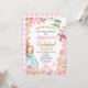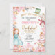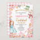 Invitation d'anniversaire sur le thème d'Alice au pays des merveilles, avec Alice, le lapin blanc, le chapeau du chapelier fou, une théière rose, des tasses empilées, un cupcake, des biscuits et de beaux arrangements floraux roses. Cette invitation d'anniversaire pour fille sur le thème d'Alice au pays des merveilles est idéale pour une fête d'anniversaire sur le thème du pays des merveilles pour petite fille.