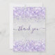 Un carte de remerciements d'anniversaire féminin et élégant. Une fausse couleur arrière - plan à l'aspect argent. Avec une parties scintillant violette et violette, pétille. Sur l'avant grand main écriture et le texte : Merci. Retour : Personnalisez et ajoutez Votre note de remerciement et votre nom. Le nom est écrit avec un script de style moderne écrit à la main avec des swashes.