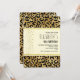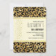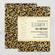 Une invitation d'anniversaire avec un motif élégant représentant des taches de léopard exotiques en noir sur fond doré. Un cadre rectangulaire couleur crème avec une bordure en faux foil doré superposé avec votre texte de fête à l'intérieur. Des confettis dorés le long de la bordure gauche.
