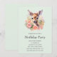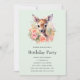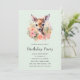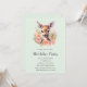 Invitation d'anniversaire avec une belle illustration représentant un cerf mignon. Entouré de roses et de fleurs roses.