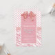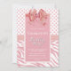 Une invitation d'anniversaire rose et blanc avec un arc festif, des bandes pois et zèbres tandis que le texte est encadré d'une fausse bordure de parties scintillant.