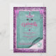 Un mignon et brillant violet et turquoise invitation d'anniversaire de licorne, avec un visage de licorne violette avec des yeux et une corne brillants, des arcs roses avec des serpentins, parchemin turquoise, ballons verts et minuscules licornes vertes. Les bords des deux côtés sont encadrés de parties scintillant rose et violet. Au verso de l'invitation se trouve un grand visage de licorne violette, parsemé d'étincelles et de parties scintillant. Tous les détails peuvent être facilement personnalisés pour convenir à votre propre événement.