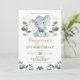 Impressionnez vos invités avec cette mignonne invitation d'anniversaire. Il présente l'illustration d'un adorable éléphant de bébé, une verdure élégante d'aquarelle en vert tendre et or accompagné d'un lettrage élégant. Il est accompagné d'un motif de feuille correspondant sur le dos. Utilisez les champs modèles pour ajouter vos détails. Si vous souhaitez modifier le style de police, la couleur ou le placement de texte, cliquez simplement sur le bouton "Customiser plus loin".