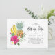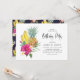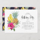 Une invitation à la fête d'anniversaire tropicale colorée avec de l'aquarelle illustrant des ananas, des bananes, des pluméries et des hibiscus roses chauds. Customisez en ajoutant vos noms, date, heure et autres détails de l'événement. Cette invitation tropicale est parfaite pour les anniversaires d'été et de luau.
