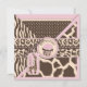 Les posters de animaux bruns et crèmes de safari sauvage de patchwork avec l'arc 3D-look et les équilibres avec l'étiquette de nom de girafe et le cercle de petit gâteau étiquettent le sixième design de carte d'invitation d'anniversaire.