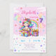 Adorable fille unicorn pastel arc-en-ciel invitation fête d'anniversaire - mignonne rose lavande et violet avec licorne assis sur les cadeaux.