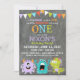 Petits monstres mignons et effrayants sur l'arrière - plan en tableau noir avec une bande grunge colorée dos design carte d'invitation d'anniversaire.