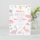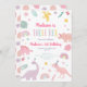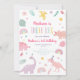 Cette adorable invitation à l'anniversaire présente des dinosaures dessinés à la main, des arcs-en-ciel et des feuilles aux couleurs pastel.