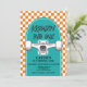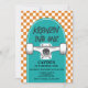 Skateboard Birthday invitation avec chèque orange et skateboard bleu.
