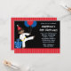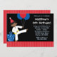 Une jolie invitation à l'anniversaire sur le thème des arts martiaux pour les garçons. Avec une illustration de garçon afro-américain portant une ceinture jaune. Dans les tons bleus, rouges et noirs. Idéal pour une fête d'anniversaire de Taekwondo ou de Karate. customisez facilement avec vos informations de fête.