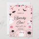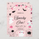 Cette jolie carte d'invitation à la fête d'anniversaire de la fille d'Halloween présente des illustrations d'un fantôme, d'un chat noir, d'une araignée, d'une chauve-souris et de citrouilles. Le texte dit, "Éffrayant."