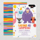 Invitez les amis de votre petit à une fête d'anniversaire pleine de plaisir, de mystère et de douceur mythique ! Cette charmante invitation présente des cryptides sympathiques de style cartoon comme Bigfoot, l'Homme-Mouche, Nessie, l'Abominable homme des neiges, le Diable du New Jersey et Chupacabra, tous souriants et prêts à célébrer.