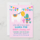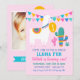 Venez vous joindre à nous pour une fête complètement llama avec cette invitation d'anniversaire colorée pour filles. Un lama illustré festif drapé dans une bannière de guirlande arc-en-ciel se tient parmi les cactus du désert sur un fond rose vif. Un lettrage gras "Llama Fun" en fuchsia et sarcelle annonce la célébration, avec un espace pour la photo de votre enfant sur le devant. Tout le texte est entièrement personnalisable, y compris le nom, l'âge et les détails de la fête.