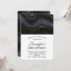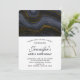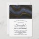 Une invitation d'anniversaire avec une belle image de pierre d'agate abstraite sombre. Les couleurs tourbillonnent en vagues. Les couleurs principales sont le noir, le gris-bleu avec un ruban doré factice qui traverse le design. Moderne et tendance.
