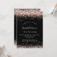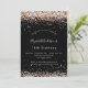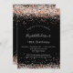 Une invitation moderne, élégante et glamour pour une fête d'anniversaire du 18ème (ou tout âge). Un arrière - plan noir décoré de fausse parties scintillant rose dorée, brille. Le nom est écrit avec un script de style à la main de couleur dorée moderne. Personnalisez et ajoutez les détails de votre fête.