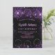 Une invitation à la fête d'anniversaire de 21e anniversaire, féminine et féminine (ou tout âge). Devant : Un arrière - plan noir chic. Décoré avec de la poussière de parties scintillant en faux violet foncé. Personnalisez et ajoutez un nom, les détails de la fête et 6 photos. Le nom est écrit avec un script de style écrit à la main, des lettres de couleur violet clair. Retour : arrière - plan noir et fausse parties scintillant.