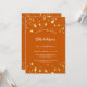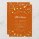 Un arrière - plan orange brûlé décoré d'étoiles dorées. Personnalisez et ajoutez un nom et des détails du parti. Le nom est écrit avec un script de style écrit à la main, des lettres de couleur blanche.
