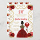 Cette invitation à la fête d'anniversaire présente un cadre doré élégant, une belle princesse à la peau foncée et une robe rouge, des fleurs et un ballon. C'est parfait pour une fête d'anniversaire.