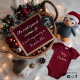Cette photo à plat présente un charmant manchot de Noël au crochet, un panier festif rempli de décorations de Noël et de verdure, et un body rouge pour bébé avec un espace pour personnaliser le nom de votre bébé. Niché à l'intérieur du panier se trouve un tableau à lettres classique affichant votre message spécial. Que vous partagiez votre nouvelle sur les réseaux sociaux, imprimiez une carte souvenir ou ajoutiez un moment spécial à l'album de votre bébé, ce design de vacances neutre en termes de genre est une façon joyeuse de célébrer la saison et votre famille grandissante.