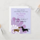 De mignonnes annonces de sauvegarde de date de mariage réalisées en bleu pervenche, avec une grande fleur violette et blanche élégante. Des graphiques d'un dachshund brun et d'un noir, avec des cœurs de lavande entre eux, ornent le bas de la carte. Tout le texte est personnalisable pour répondre à vos besoins. Mignon pour les amateurs de dachshunds et un excellent moyen d'annoncer votre mariage imminent aux invités de province.