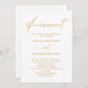 Cet avis d'annulation de mariage de couleur or et blanc moderne présente une élégante écriture calligraphique en or faux et informe les invités que la cérémonie a été annulée en raison d'événements imprévus, et que vous les contacterez lorsqu'elle aura été reprogrammée.