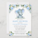 Aquarelle Bleu Blanc Floral Baby Elephant avec un Baby shower Bleu Bow Invitation. Comprend de beaux roses bleu aquarelle, des fleurs blanches et de la végétation botanique. Texte bleu et argent.