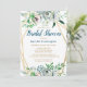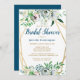 Les fleurs d'aquarelle bleu, rose et blanc boho dans un cadre doré double géométrique arborent des fleurs botaniques et baies et le dos de la carte a une belle et riche couleur bleu foncé. Customisez cette invitation à la douche nuptiale avec vos propres couleurs et polices ou gardez cette typographie populaire comme elle est pour votre commodité.