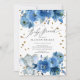 Belle aquarelle indigo bleu marine fleurs bébé éléphant brunch design avec parties scintillant en or dispersé et une feuille de coordination pour une touche spéciale
