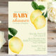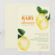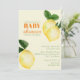 Cette invitation à baby shower personnalisée présente un thème d'agrumes sur un arrière - plan jaune clair. Deux citrons aquarelles sont placés en haut à droite, et un autre citron en bas à gauche. Le titre "Baby shower" est imprimé en orange vif, le reste du texte en vert citron.