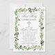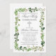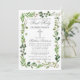 Moderne Elégant Première Sainte Communion Invitation inclut des feuilles d'eucalyptus aquarelle et d'autres beaux feuillage botanique verdoyant. Croix d'argent.
