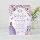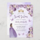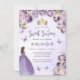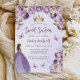 Cette adorable invitation à la fête d'anniversaire Sweet sixteen présente une bordure de fleurs violettes et d'ivoire sur un arrière - plan d'aquarelle violette pâle. Une tiara dorée, une fille aux cheveux foncés en robe de princesse violette et de petits papillons violets ornent le texte. Les mots "Sweet sixteen" et le nom de l'invité d'honneur apparaissent dans un élégant script d'écriture violet, avec le texte restant en gris sans serif.