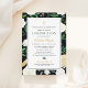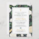 Cette première communion sainte et élégante invitation à la fête du déjeuner pour une fille présente un élégant libellé personnalisé pour votre événement spécial accentué par une croix d'or et encadré par un motif floral frappant de fleurs roses neutres blanches et crème, vert et or vert, et une couleur arrière - plan noire douce. Un arrière - plan vert souple de coordination apparaît au dos de la carte.