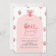 Une mignonne invitation au baby shower comporte une fraise aquarelle et un arc. Ces invitations d'anniversaire sont facilement customisées pour votre événement en ajoutant simplement vos détails.