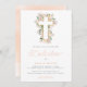 Une jolie invitation au baptême, au baptême ou au baptême pour votre petite fille. Ce design comprend une croix d'aquarelle entourée de fleurs de pêche et de feuilles verts. Le titre de l'événement est en police de pêche cursive. Le verso est doté d'un lavage à l'aquarelle pêche.