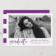 Invités Invitations à votre fête de remise de diplômes avec nos invitations à la soirée de remise de diplômes design et moderne Watercolor Brush Script! Les invitations modernes à la fête de remise de diplômes montrent la photo du diplômé encadrée en blanc avec "diplômé" dans un script de brosse à aquarelle violet tendance. Ajoutez le nom du diplômé, l'école, l'année de remise des diplômes et les plans futurs. L'invitation revient à un arrière - plan rayé violet et blanc avec espace pour les détails de votre fête.