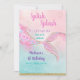 Cette adorable invitation présente une queue de sirène colorée avec des motifs de parties scintillant en faux or.