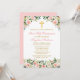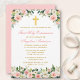 Elégante aquarelle rose blanc Floral First Holy Communion Invitation inclut roses roses, fleurs blanches et verdure. Croix d'or.