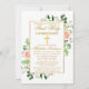 Aquarelle moderne Elégante Pink Floral First Holy Communion Invitation inclut roses roses, feuilles d'eucalyptus et d'autres beaux feuillage botanique. Croix d'or.