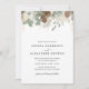 Aquarelle rustique faire-part de mariage de fleurs d'hiver. Fleurs, eucalyptus, cônes de pins et branches de pins sur l'arrière - plan vert de la forêt. Customisez cette conception avec vos informations personnelles et votre initiale sur le côté arrière.