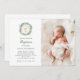 Cette invitation Baptême ou Christening simple et minimaliste présente une élégante couronne d'aquarelle pleine de verdure et de feuillage rustique, avec une illustration d'un calice et d'une subtile aquarelle verte au centre, sur un arrière - plan blanc. La photo de votre bébé est également présentée.