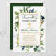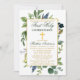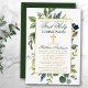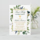 Elégante aquarelle Botanique Verdure Première Communion L'invitation comprend des accents bleus. Cadre Or. Croix d'or. Retour vert de la forêt.